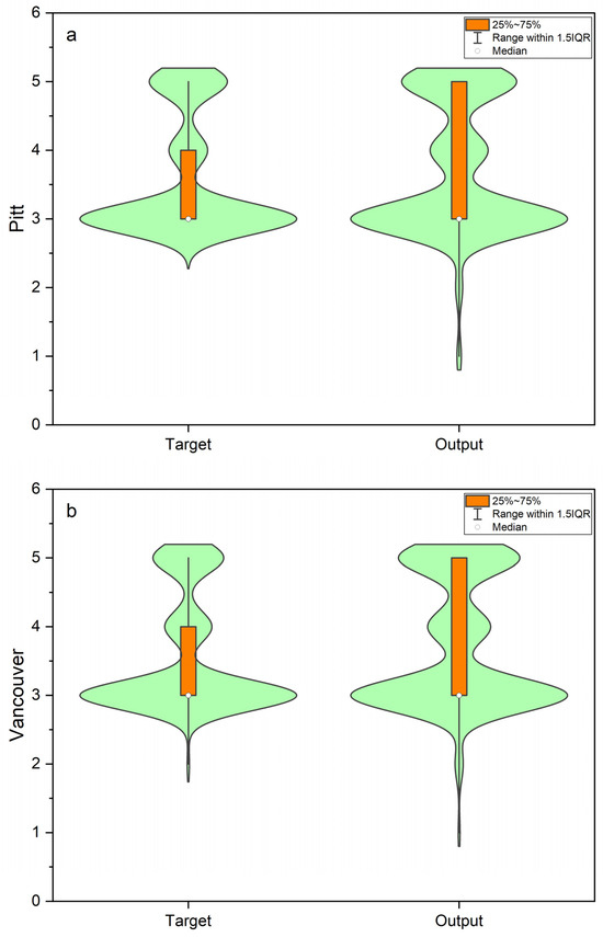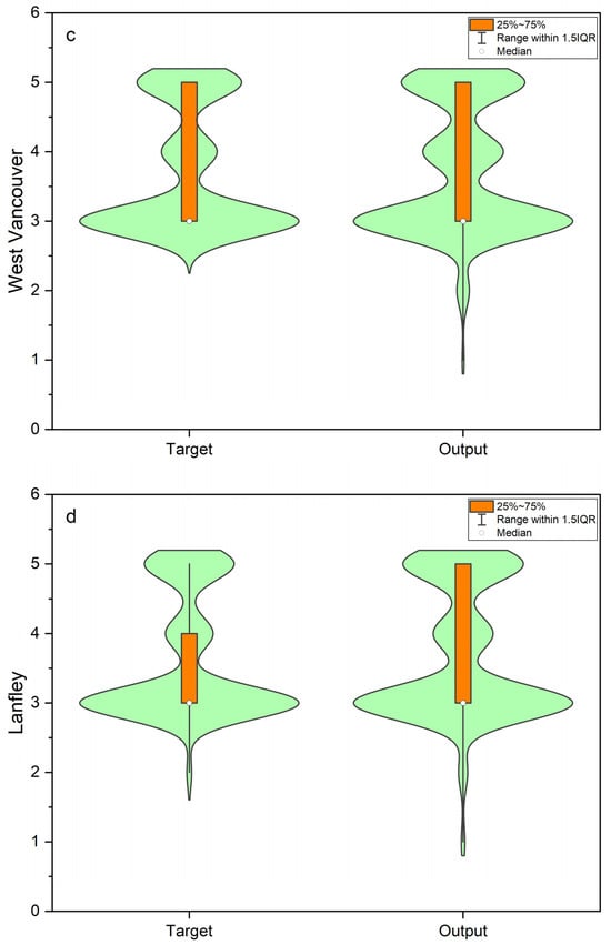 Distribution of the test phase target and output values (a) Pitt, (b) Vancouver, (c) West Vancouver, and (d) Lanfley.