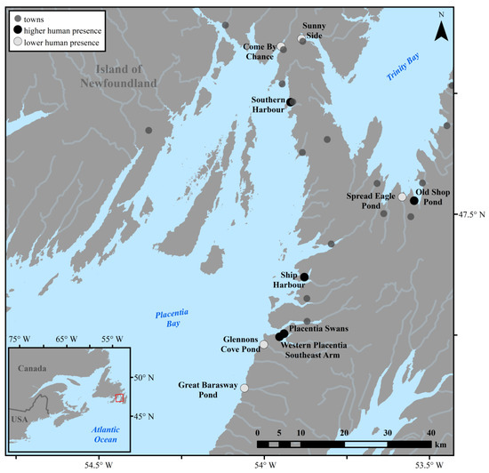Study sites were selected based on previous knowledge of eelgrass presence, as observed by Matheson et al. [22] and Rao et al. [26]. All sites consisted of subtidal eelgrass meadows. To help understand the prevalence of anthropogenic stressors, five sites were selected in areas with limited human development in the surrounding area, while five other sites were selected in areas experiencing greater levels of human activities—where anthropogenic disturbances (i.e., anchor damage, propeller scaring, and dock shading) or nutrient pollution could be expected (Figure 1). Sites with higher human presence were along the shoreline of a community where drainages or docking infrastructure for motorboats were present. Sites with lower human presence were selected to have minimal presence of infrastructure except for roads to allow for vehicle access. Seven of those study sites were selected in Placentia Bay, while three sites were selected in Trinity Bay (Figure 1), a nearby coastal area outside the invasion range of the European green crab.