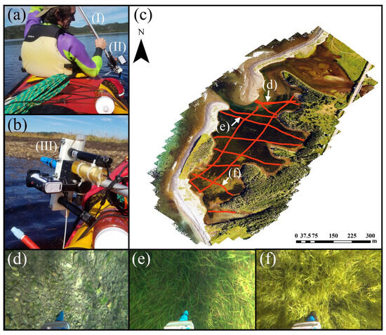 Method of ground-truth data collection. (a) Operation of telescopic pole (I) with affixed Sony FDR-X3000 ActionCam (II). (b) The camera was affixed to the telescopic pole using a custom-built camera mount (III). (c) Ground-truth video observation transects (red lines) for Great Barasway Pond (GBP). Example ground-truth images are provided for (d) sediment, (e) eelgrass, and (f) brown algae.