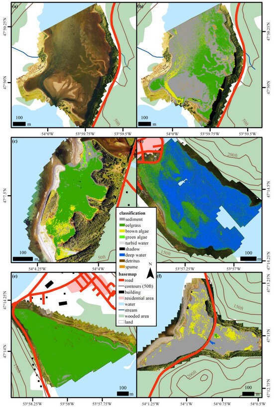 Orthomosaic aerial image (a) and classified map (b) of Come By Chance Gut. Maps of Great Barasway Pond (c), Placentia Swans (d), Western Placentia Southeast Arm (e), and Glennons Cove Pond (f).