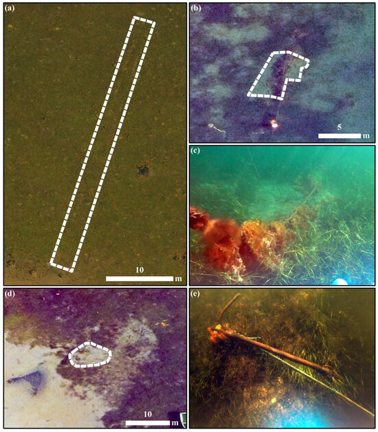 (a) All-terrain vehicle (ATV) disturbance area, (b) buoy disturbance area, (c) underwater image of buoy rope disturbance, (d) anchor disturbance area, and (e) underwater image of anchor in eelgrass meadow.
