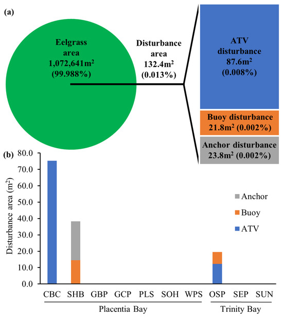 (a) Portion of disturbance area relative to the total area of eelgrass mapped. (b) Disturbance area at each site caused by anthropogenic activities. No disturbances were observed at GBP, GCP, PLS, SEP, SOH, SUN, or WPS. CBC: Come By Chance Gut; GBP: Great Barasway Pond; GCP: Glennons Cove Pond; PLS: Placentia Swans; OSP: Old Shop Pond; SEP: Spread Eagle Pond; SHB: Ship Harbour; SOH: Southern Harbour; SUN: Sunny Side; WPS: Western Placentia Southeast Arm.