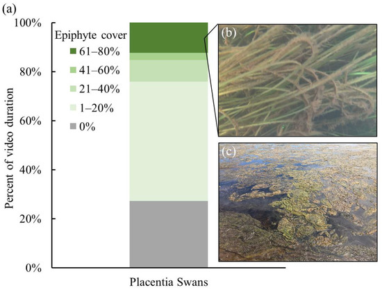 (a) Proportion of underwater video duration by epiphyte cover category, measured as the amount of eelgrass in the video frame covered by epiphytes, when eelgrass was present in the ground-truth video at Placentia Swans. (b) Underwater image of epiphytes corresponding to the 61–80% epiphyte cover category. (c) Example of dense algal cover observed during field visits to western Placentia Southeast Arm.