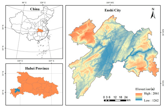 The terrain of Enshi city varies greatly, exhibiting complex and diverse landforms, and an uneven distribution of light, rain, and heat. These factors are reflected in land use, resulting in the land use mode of low hills, medium-high mountains, and high mountains, and demonstrating the unique “three-dimensional” characteristics of land use in mountainous areas. The location and terrain of the study area are shown in Figure 1.
