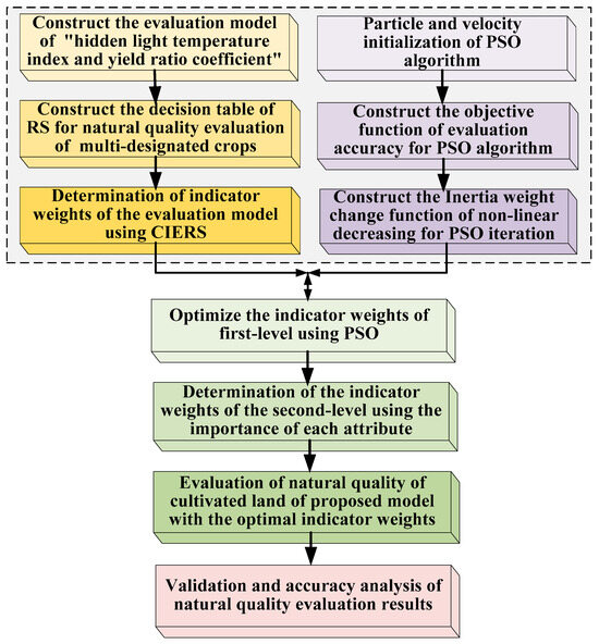 Flowchart of the natural quality evaluation of cultivated land based on the CIERS-PSO method.
