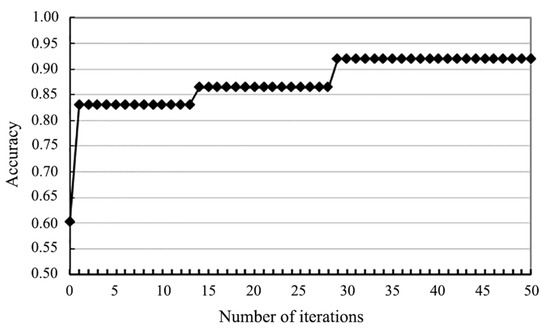 The PSO algorithm conducts 50 iterations to optimize first-level indicator weights. We recorded the changes in the fitness value of the objective function at each iteration. The changes in the accuracy of the natural quality evaluation of the cultivated land are shown in Figure 3.