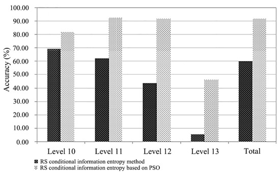 A comparison of the evaluation results of the RS conditional information entropy method and the RS conditional information entropy method based on PSO is shown in Figure 4.