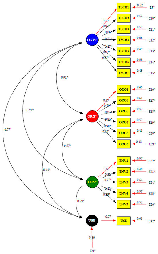 CFA was conducted to confirm the significance of these identified T–O–E factors influencing the use of IWTs for the safe delivery of built environment projects in South Africa. Robust maximum likelihood (RML) estimation in EQS 6.4 was used as it provides more robust fit indices through its Satorra–Bentler scaled chi-square (S-Bχ2), which is a more robust χ2 [69,75]. Table 3 shows the standardised coefficient (λ) for each measurement variable under the three different groups. This λ depicts the construct validity of these variables. Past studies have proposed several thresholds for an acceptable λ. This has ranged from 0.4 to 0.7 in many studies [74,76]. The result in Table 3 shows that all the variables have a λ ranging from 0.75 to 0.900, thus confirming that they all met the construct validity threshold. Also, Table 3 shows the result of the internal consistency of these variables using the α and Rho alpha (ρA) tests, as suggested in past studies [77]. Past studies have noted a threshold of above 0.7 for internal consistency to be deemed achieved [72,78]. The result revealed an α-value of 0.967 and a ρA-value of 0.975, which are higher than the set cut-off, thus confirming internal consistency. The result in Table 3 further shows the significance of each variable along with their Z-statistics. It has been suggested to make at least one variable a fixed parameter [73], and as such, no Z-value is assigned to the first variable of each dimension in the table. All the assessed variables were significant to the use of IWTs for the safe delivery of built environment projects, as their Z-statistics revealed a value of well above 1.96 (p < 0.05). The significance of these variables was further confirmed through the coefficient of determination (R2). Past studies have noted that R2 of 0.75, 0.50 and 0.25 are considered substantial, moderate, and weak [78]. The result in Table 3 shows that all the assessed variables have between moderate and substantial power to determine the use of IWTs within the country. The derived R2 values ranged from 0.57 to 0.84, implying that these variables have the power to impact the use of IWTs.