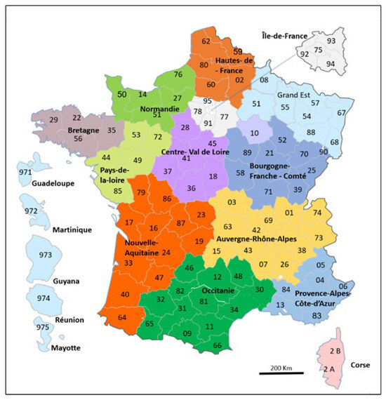 This data swiftly escalated to 32,300,330 infections, equating to 48% of the population, along with 147,692 deaths by 21 July 2022 [4,52]. By 6 September 2023, France reported a total of 39,079,469 confirmed COVID-19 cases and 167,985 fatalities [50]. Over 1000 infections per 100,000 inhabitants were concentrated in 20 cities and urban agglomerations. Public Health France [52] reported infection rates nearing 1400 in these areas with active COVID-19 spread. On 4 March 2021, France announced the onset of the third wave, with notable regional disparities in infection rates. For instance, the Alpes-Maritimes in Southeast France recorded 486 infections per 100,000 inhabitants, and the Pas-de-Calais region in the North reported 407 infections per 100,000 inhabitants [54]. These figures support the hypothesis of a correlation between socio-spatial factors and the variance in infection/death rates across different regions. Accordingly, this study investigates the rate of cumulative confirmed COVID-19 infections in France at a regional level. As of 2022, France is divided into three tiers of territorial collectivities: 34,955 “communes”, 101 “départements”, and 18 regions (Figure 1).