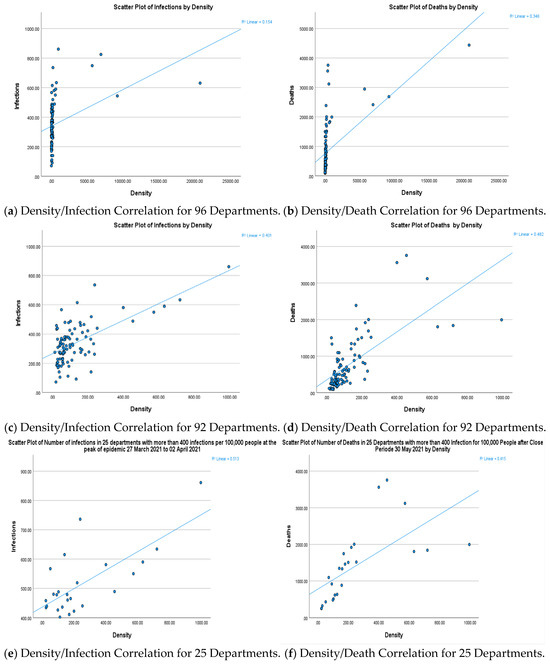 The statistical analysis in Figure 3a,b and Table 2 reveals a moderate positive correlation between population density in 96 departments and the COVID-19 infection rate per 100,000 inhabitants, with an R2-value of 0.154 and an R-value of 0.39 (p-value < 0.001). However, the correlation between population density and deaths was moderately positive and stronger than that for infections, with an R2-value of 0.40, an R-value of 0.589 (p-value < 0.001). Additionally, the correlation between infections and deaths was positive and strong, with an R-value of 0.654 (p-value < 0.001). This indicates that departments with higher infection rates recorded a greater number of deaths, demonstrating a direct proportionality between infection/death rates. Remarkably, Table 1 shows that extreme data were observed in the departments of Paris (75), Seine-Saint-Denis (93), Val-de-Marne (94), and Hauts de Seine (92), reported very high population densities per square kilometer and the highest numbers of infections/deaths in the third wave of COVID-19 up to 3 May 2021, as follows: