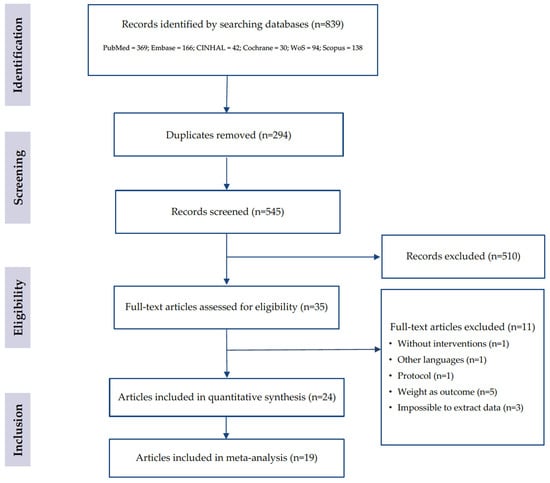 The search strategy produced 839 records. After the removal of 294 duplicates, 545 titles and abstracts were screened. Among these, 35 full-text articles were read, and 11 did not meet the inclusion criteria and were excluded (Supplementary Material—Table S2). No further relevant studies were identified after examining the reference lists of the included articles. At the end of the screening process (Figure 1), 24 articles were included in the systematic review, and 19 of them were meta-analyzed.