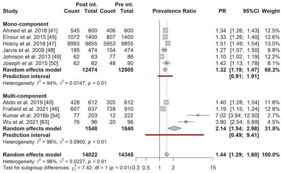 The forest plot of the subgroup meta-analysis for the effectiveness of mono-component and multi-component educational interventions in the knowledge domain. PR = prevalence ratio; CI = confidence interval. Squares represent each study PR estimate while diamonds represent the pooled PR estimate (for each subgroup and overall). Sidebars represent estimates’ confidence intervals [40,41,45,46,47,48,49,50,54,63].
