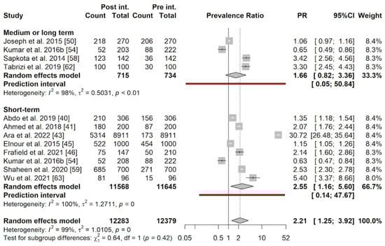 The forest plot of the subgroup meta-analysis for the effectiveness of medium- or long-term and short-term educational interventions in the practices domain. PR = prevalence ratio. Squares represent each study PR estimate while diamonds represent the pooled PR estimate (for each subgroup and overall). Sidebars represent estimates’ confidence intervals [40,41,43,45,46,50,54,58,59,62,63].