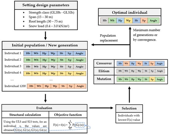 To represent different potential designs for the roof structure, an initial population of 1200 random individuals was generated. The selected population size is a compromise between the computational cost and the probability of identifying the optimal solution. The possible dimensions (i.e., Hb, Hp, Wb, Wp, and angle) and arrangements (i.e., Sb, Sp) of beams and purlins were considered through specific values in their chromosomes. Each individual within the population corresponds to a potential structural solution, encoded in a chromosome comprising seven genes: Hb, Hp, Wb, Wp, Sb, Sp, and angle. Then, the evaluation of each design solution depended on the utilization ratios determined within the structural calculation program developed in Matlab to verify the Eurocode 5 [