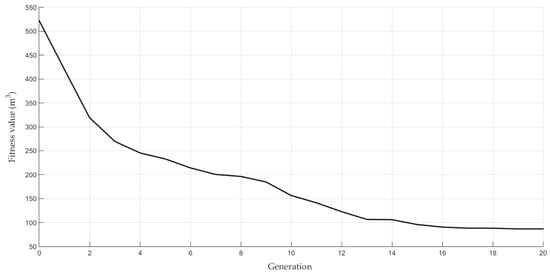 Then, the modified objective function (F(x) in Equation (1)) measures the fitness of individuals in terms of volume, in m