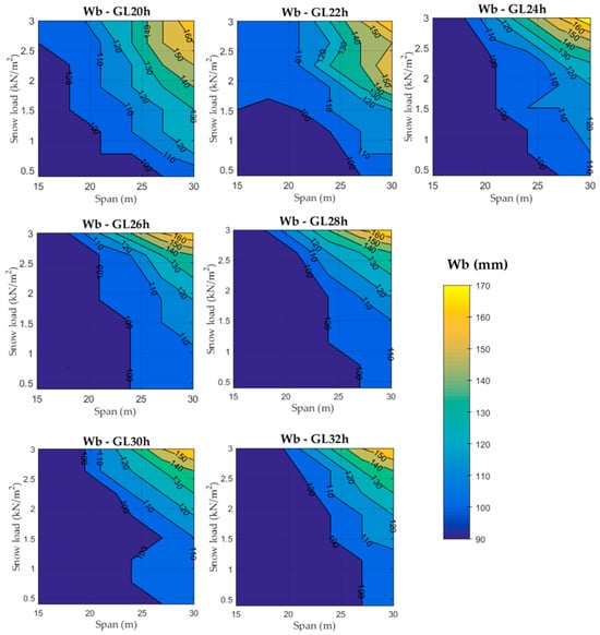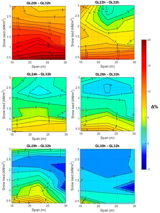 For structures exposed to snow loads greater than 2.5 kN/m2, a similar timber volume requirement, with at most a 3% difference, was noticed for most strength classes (GL 24h, GL 26h, GL 28h, GL 30h, and GL 32h). Thus, suggesting the existence of a broad range of wood species that effectively could rival the most commonly employed (GL 24h and GL 32h). Similarly, for snow loads greater than 1 kN/m2, GL 30h and GL 32h classes also resulted in similar consumption of timber volumes (up to 1%). Across all strength classes, the largest differences in volume occur at span values close to 15 m and for lower snow loads, with differences up to 20% for GL 20h compared to GL 32h. In any case, a strong relationship exists between the increase in the timber volume and the reduction in the strength class or the modulus of elasticity.