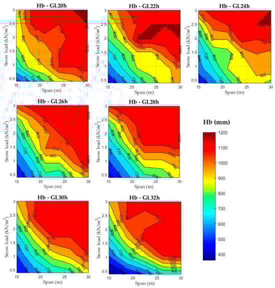 19], who addressed the optimization of different beam geometries as well as different qualities of glulam (i.e., GL 22h, GL 24h, GL 26h, GL 28h, GL 30h, and GL 32h).