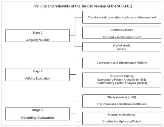 Based on the above background, the aim of this study was to empirically determine the validity and reliability of the SUS-FCQ in the Turkish population. Within the scope of the validity and reliability of the SUS-FCQ, the standard translation–back translation method ensured linguistic equivalence. Then, content, convergent, discriminant, and construct (exploratory factor analysis (EFA) and confirmatory factor analysis (CFA)) validity and reliability (test–retest and internal consistency) were evaluated.