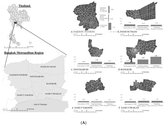 This study was carried out in the Bangkok Metropolitan Region, delineated as the study area in Figure 1. The Bangkok Metropolitan Region encompasses Bangkok and the five adjacent provinces of Nakhon Pathom, Pathum Thani, Nonthaburi, Samut Prakan, and Samut Sakhon.