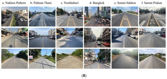 Study area: The Bangkok Metropolitan Region (BMR). (A) General information of the study area. (B) The diverse road environments in the study area.