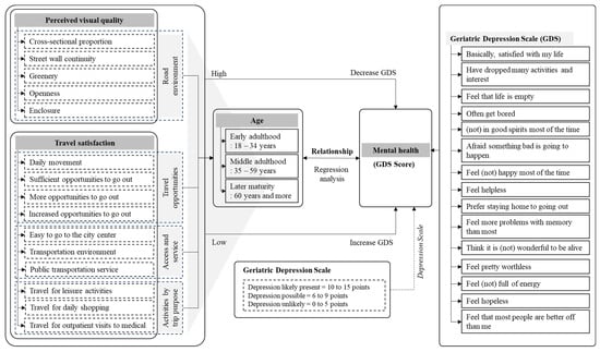 This research categorized participants into three age groups: early adulthood (18–34 years), middle adulthood (35–59 years), and later maturity (60 years and above). Therefore, given the multifaceted nature of the factors comprising travel satisfaction and perception of the streetscape, multiple regression analysis was employed. Statistical analyses were conducted by using SPSS Statistics version 28.0. Multiple regression analysis enables evaluation of the strength of the relationship between an outcome (the dependent variable) and multiple predictor variables. It also allows for assessing the significance of each predictor in the relationship, while controlling for the effects of other predictors. This study designs a framework for analysis comprising four different models which exhibit mental health problems, identified by GDS values meeting the cut-off point of 5. Model 1 represents individuals within the early adulthood age group (18–34 years). Model 2 comprises individuals in the middle adulthood age group (35–59 years). Model 3 consists of individuals in the later maturity age group (60 years and above). Model 4 encompasses individuals across all age groups.