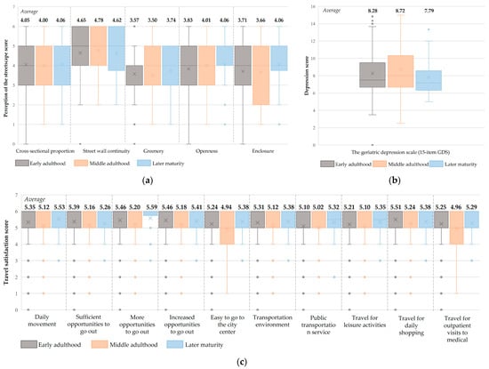 When considering the factors of travel satisfaction, perception of the streetscape, and mental health by age group, as illustrated in Figure 3, it was observed that the later maturity age group exhibited a higher total average of travel satisfaction factors compared to other age groups ( = 5.39). Conversely, the middle adulthood age group had the lowest average overall travel satisfaction ( = 5.05). Overall, the average satisfaction level was considered to be moderate to high. Additionally, in terms of perception of the streetscape, the later maturity age group presented a higher total average of travel satisfaction factors compared to other age groups ( = 4.11). The early adulthood age group exhibited the lowest average overall satisfaction with travel ( = 3.96). The summary of data in Table 3 demonstrates the overall level of satisfaction which is considered to be moderate. Additionally, when considering the depression scale, it was observed that the middle adulthood group had the highest depression values, while the later maturity age group had the lowest depression values compared to other age groups.