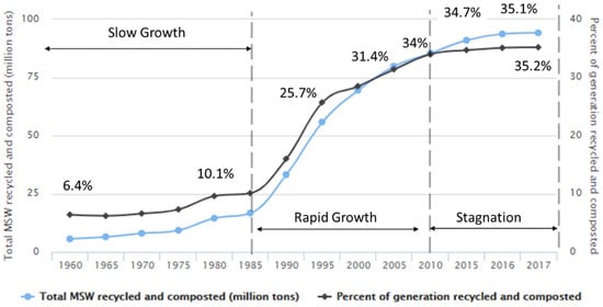 Recycling in the US has taken place since 1960. In this study, recycling refers to a collective form of waste divergence that includes all levels, from primary, secondary, and tertiary to quaternary [16]. The EPA defines the recycling rate as a combined recycling and composting rate [2] and has collected data since 1960. The recycling rate has been split into three periods (Figure 1). Period one (1960–1985) was characterized by a period of slow growth, in which the recycling rate increased by less than 4% in 25 years. Period two (1985–2010) was a period of rapid growth, where the recycling rate increased by approximately 25% in 25 years. Since 2010, the percentage of recycled and composted material has plateaued at around 35%, with the recycling rate leveling at 25% and composting rate leveling at 10%, which is a period of stagnation [1].