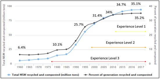 Figure 3 shows the three experience levels with changes in the US recycling rates. The EPA graphic extends from 1960 to 2017, and experience levels would be by 2020. The reported recycling rates can be split into three major periods in relation to this research. Period one (1985–1994) represents a rapid increase in the percentage of MSW recycled and composted, approximately 15%. Level 1 individuals worked in the waste management industry when the recycling rate began to become stagnant. Period two (1995–2009) represents a slower increase and/or rise in recycling rate, approximately 10%. Level 2 individuals would have experienced slowed growth and eventual stagnation of the recycling rate. Finally, period three (2010–2017) was the period when the recycling rate began to stagnate, and that period extends to the present day. Respondents in experience level 3 would have knowledge of the recycling industry throughout multiple transitions.