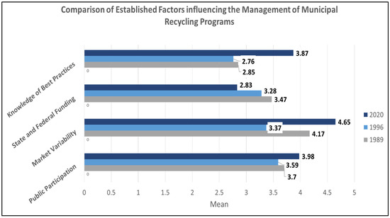 Figure 4 shows a comparison of mean scores of the established factors influencing the management of municipal recycling programs in 1989, 1996, and 2020. Originally, there were six factors listed in Folz’s studies; our study included four factors after eliminating the lowest-scored factor, “theft and scavenging of recyclables”, and simplifying financial assistance-related factors into “state and federal funding”. Therefore, four factors, “knowledge of best practices”, “state and federal funding”, “market variability”, and “public participation”, were examined as established factors. Also, Folz’s studies and our studies have unequal sample sizes. Figure 4 gives an approximate idea of whether certain factors are still regarded as important or not, rather than directly comparing Folz’s prior studies and this study. The mean scores in 1989 and 1996 were adopted from Folz’s studies, while the mean scores of 2020 were computed using a descriptive statistic of means for each factor in our survey.
