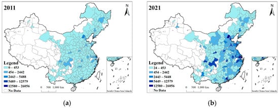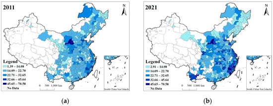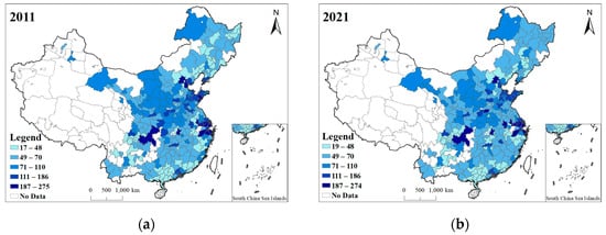The spatial expression of GTI in Chinese cities in 2011 and 2021.