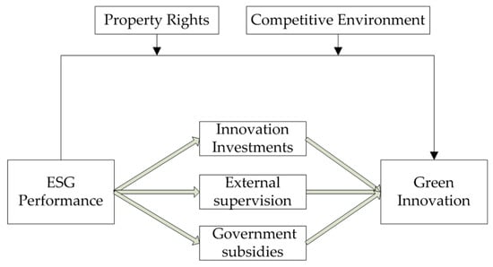 After analyzing data from Chinese-listed companies over the period from 2013 to 2022, this study successfully achieved its objectives. We find that traditional energy firms indeed can foster green innovation by enhancing ESG performance. Furthermore, both internal factors and external stakeholders are positively influenced by improved ESG performance, which, in turn, catalyzes green innovation. Moreover, our exploration into the effects of ESG performance on green innovation reveals that corporate property rights and the competitive environment faced by firms exert a heterogeneous effect on this dynamic. The theoretical model is shown in Figure 1.