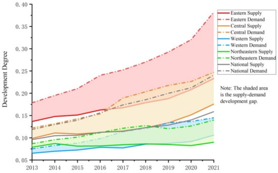 Combining the analysis of supply and demand development, the health industry in China is in a state of “supply shortage”, and the gap in the level of supply and demand development has been widening year by year. During the period from 2013 to 2021, the development degree of supply in various regions was lower than that of demand. According to the calculation of the gap in the level of supply and demand development in the average health industry in China, the difference was only 0.0227 in 2013, while it had reached 0.0820 in 2021. Moreover, the average annual growth rate of demand over the eight years was 12.85%, while supply was only 8.17%, which will further widen the gap between supply and demand in the future. By analyzing the gap in supply and demand between regions, it was found that the regions with higher levels of health industry development also have larger gaps in supply and demand development. Ranking regions according to the difference in supply and demand development degree in 2021 from high to low, they are, respectively, the eastern, central, northeastern, and western regions, with differences of 0.1495, 0.0715, 0.0499, and 0.0390. It can be seen that although the overall scale of the health industry continues to expand, the problem of imbalance in supply and demand development is becoming more serious. The promotion of the synergistic development of supply and demand in the health industry is an urgent issue that needs to be addressed.