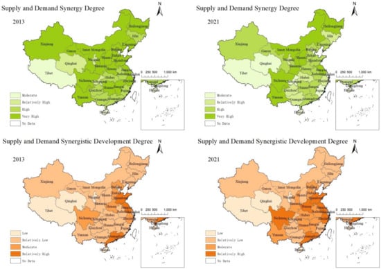 Based on Table 5, the supply–demand synergy and supply–demand synergistic development values of the health industry in various provinces (autonomous regions and municipalities directly under the central government) of China are calculated. Using data from 2021 as the baseline, and referring to the results of the natural break method for grouping, the level of synergy is divided into a moderate level (value lower than 0.6419), a relatively high level (value between 0.6419 and 0.8041), a high level (value between 0.8041 and 0.8987), and an extremely high level (value higher than 0.8987); the level of development is divided into a low level (value lower than 0.2041), a relatively low level (value between 0.2041 and 0.3445), a moderate level (value between 0.3445 and 0.4585), and a relatively high level (value higher than 0.4585). Selecting data from the years 2013 and 2021 as representatives, the distribution map of the composite supply–demand synergy and development degree of the health industry in China’s provinces is drawn using ArcGIS software 10.2 (Figure 4 is drawn based on the standard map of the Ministry of Natural Resources Map Technical Review Center (Review Number GS(2022)1873), and the boundaries of the base map remain unaltered) (Figure 4).