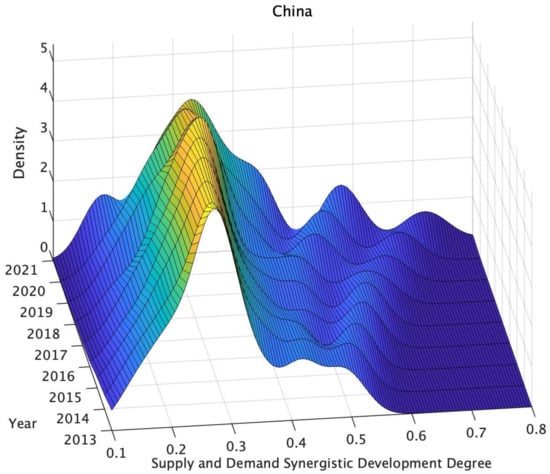 Density curve of supply–demand synergistic development degree of China’s health industry from 2013 to 2021.