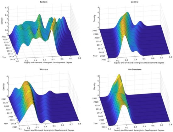 Based on the calculated degree of supply–demand synergistic development in the health industry, this study adopts the kernel density estimation method to investigate the dynamic evolution of the distribution of the health industry development levels during the sample period.