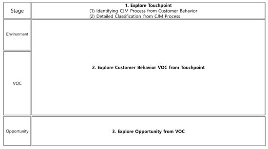 Customer observation is the act of recording product usage space, customer behavior, events, time, goals, feelings, etc., for a company so that it can offer competitive products and services [30]. In line with this perspective, the CJM observes customers’ service usage behavior and tracks their thoughts, evaluations, and emotions step-by-step, conveying them to the service providers. The CJM is a two-dimensional matrix with two axes. The horizontal axis consists of the actions, situations, and procedures that customers encounter while using the service, arranged according to their temporal flow. These elements are the touchpoints through which customers interact with the service. The CJM then analyzes the emotions, thoughts, and experiences they have while using the service [31]. The vertical axis is where the service provider selects the topics they want to obtain information about regarding the customers at the touchpoints. The service provider can change the topic according to the analysis objectives and select the emotions, thoughts, opinions, etc., of the customers at the touchpoints to analyze.