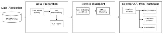 Fake review filtering is a process of removing intentionally biased or exaggerated reviews, which can have a negative impact on product purchasing decisions, from the collected reviews. In this process, we filtered fake reviews using a word arrangement analysis-based machine learning classifier [35]. Then, we conducted text preprocessing on the filtered review data to remove unnecessary special characters and convert all characters to lowercase. Finally, we reduced the text data volume by selecting only the parts of speech that matched the analysis objective using the POS tagging method [36]. In this study, we included verbs in addition to commonly used nouns and adjectives because the analysis focused on customer behavior.