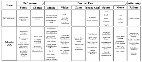 Furthermore, the product usage environment was clarified for each customer behavior stage. The environment includes the purpose of use, related smartphone apps, and additional descriptions of usage behaviors. This information helps product developers understand customer behavior better. In the VOC items, emotions and thoughts experienced by customers at each stage are expressed as VOC. Online reviews contain customer product evaluations and judgments based on their product usage behaviors. The previously mentioned behavior VOC along with background information allow for indirect observation of customer actions.
