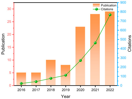 Recent advancements in data collection, analytic techniques, and the graphical representation of bibliometric networks have significantly enhanced the capacity for analyzing vast quantities of scientific literature, which include BibExcel (2017) [15], Cite Space (6.3.R1) [16], Science of Science (Sci2) [17], Pajek (2.05) [18], Publish or Perish (PoP) (8.12.4612) [19], SITKIS (6.289) [20], and VOSviewer (1.6.20) [21]. The authors conducted a comprehensive review of various analytical tools and selected VOSviewer for this study given its capability to represent bibliometric networks. These networks can be constructed based on citation, bibliometric coupling, co-citation, or co-authorship relations. The function of VOSviewer is especially useful for displaying large bibliometric maps in an easy-to-interpret way [22]. To build a network, bibliographic databases from WoS are provided as the input to VOSviewer [23]. The summary provides descriptive statistics for the identified manuscripts, including the year of publication, citations per year, prolific publishing journals, and countries, followed by two types of analyses: a citation analysis to identify important publications and a keyword co-occurrence analysis to investigate major domains of research and research domain development in the previous seven years based on authors’ keywords.