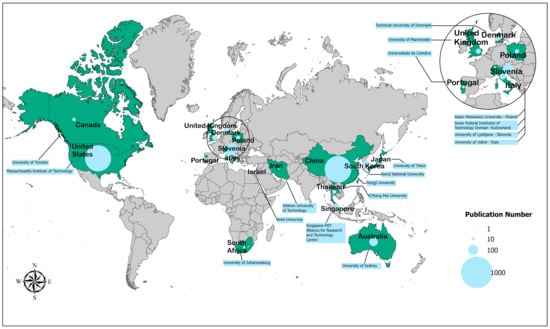It shows, from the authors’ information, that the search uncovered research from 20 countries and 229 institutions. Figure 4 displays a thematic representation of the published articles by country that have received the most citations. The four top countries with the most published papers are USA (36.0%), China (35.1%), Italy (3.6%), and Canada (3.6%). In terms of authors’ affiliations, the University of Texas System (4.5%), Tongji University (3.6%), the Massachusetts Institute of Technology (MIT) (2.7%), and the University of California System (2.7%) were the organizations attributed with the greatest numbers of published articles. The top three counties with the highest number of citations were China (720), the USA (695), and Slovenia (121).