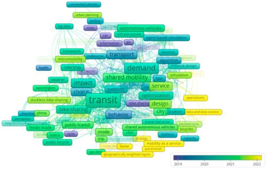 The software VOSviewer (1.6.20) generated a network of co-occurring keywords from 108 articles. Figure 5 shows the co-occurring relationship of 56 keywords out of a total of 422 that appeared at least twice in the reviewed articles. In the network, keywords are represented as nodes. The size of each keyword indicates its frequency or prominence in the dataset (likely publications, articles, or abstracts). The lines represent the strength of the co-occurrence links between keywords. For example, keywords like “transport”, “demand”, “transit”, and “shared mobility” are central and have many connections, suggesting that these are core themes of the research analyzed. The colors indicate the time of occurrence or the period during which certain keywords were more prominent, with a gradient from 2019 to 2022. The overlay visualization analysis revealed a varying keywords’ focus over the years, with terms like “bike sharing”, “parking”, and “sustainable transportation” being prominent from 2016 to 2019, followed by “public transport”, “ride sourcing”, and “accessibility” from 2019–2021. In 2022, “data”, “micromobility”, and “modal shift” were frequently occurring terms (Figure 5). The focus on “data” highlights the importance of evidence-based planning and the use of analytics to understand and optimize transportation systems. “Micromobility” reflects an increasing interest in flexible, low-carbon modes of transport such as bikes and scooters, which can fill gaps in traditional public transit systems and provide first/last-mile solutions. The term “modal shift” signifies the aim to encourage people to switch from private car use to more sustainable modes of transportation, thereby reducing congestion and emissions and enhancing urban livability. The presence of keywords like “big data”, “algorithm”, and “optimization” alongside “urban planning” and “public transport” indicates an interdisciplinary approach to studying transport systems, incorporating data science and technology into urban planning and policy analysis.