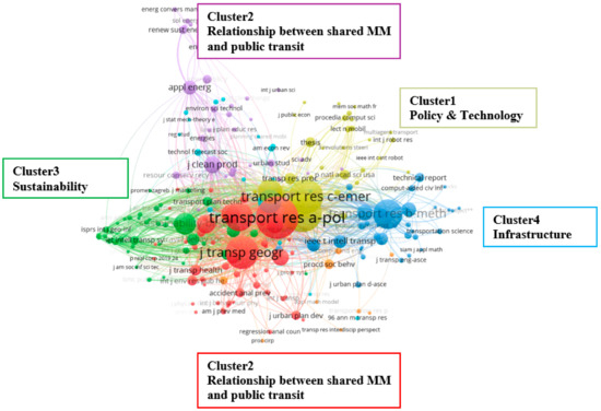Cluster 1, comprising 22 papers, centers around the theme of “policy& technology”. Key topics identified within this cluster include “policy”, “equity”, “barriers”, and “planning”. In Cluster 2, which consists of 48 papers, the primary focus lies on the “Relationship between shared micromobility and public transit”, exploring keywords such as “substitute”, “implement”, and “connecting”. Notably, the colors red and purple in Figure 6 represent a subset of Cluster 2, exploring the concept of “Shared micromobility as a feeder mode to and from public transit”, with 16 papers. Cluster 3 encompasses the theme of “Sustainability”, with the majority of publications addressing “benefit”, “emission”, “pollution”, and “physical health”. Lastly, Cluster 4 delves into the “infrastructure” theme, comprising eight papers which emphasize “mode” and “site”. The analysis of co-citations and examining the frequency and emergence of specific keywords within the literature over different time periods have proven to be invaluable in addressing RQ3. Next, representative references in each of the clusters are discussed below.