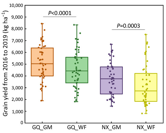 Yields of early rice at the two sites from 2016 to 2019. The n values is 48 at both sites in each treatment. GQ_GM, green manure treatment at the Gaoqiao site; GQ_WF, winter fallow treatment at the Gaoqiao site; NX_GM, green manure treatment at the Nanxian site; NX_WF, winter fallow treatment at the Nanxian site. Within each box, the solid line represents the median value, while the hollow block depicts the mean value. Top and bottom edges represent 75 and 25 percentiles, respectively. The solid circle represents value of each sample.