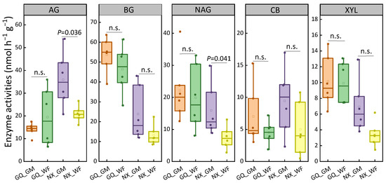 Activities of enzymes in C metabolism. AG, α-glucosidase; BG, β-glucosidase; NAG, N-acetyl-glucosamidase; CB, β-cellobiosidase; XYL, β-xylosidase. n.s., no significant difference at p < 0.05 level. Figure 1 shows treatment abbreviations. Within each box, the solid line represents the median value, while the hollow block depicts the mean value. Top and bottom edges represent 75 and 25 percentiles, respectively. The solid circle represents value of each sample.