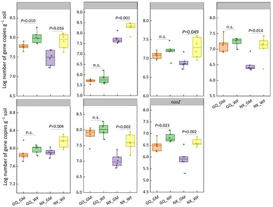 Quantities of function genes involved in N cycling. AOA–amoA, amoA gene of ammonia-oxidizing archaea; AOB–amoA, amoA gene of ammonia-oxidizing bacteria. Figure 1 shows treatment abbreviations. Within each box, the solid line represents the median value, while the hollow block depicts the mean value. Top and bottom edges represent 75 and 25 percentiles, respectively. The solid circle represents the value of each sample. n.s. indicates there is no significant difference between two treatments.
