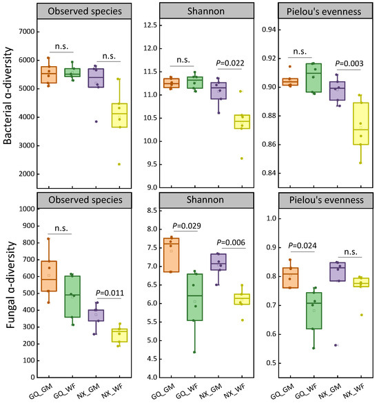 Observed species, Shannon index, and Pielou’s evenness of soil bacteria and fungi. Figure 1 shows treatment abbreviations. Within each box, the solid line represents the median value, while the hollow block depicts the mean value. Top and bottom edges represent 75 and 25 percentiles, respectively. The solid circle represents value of each sample. n.s. indicates there is no significant difference between two treatments.