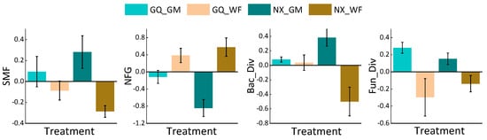 Soil chemical properties and C metabolism-related soil enzymes were clustered as SMF using the Z-score method. The SMF of GM was higher than that of WF (Figure 5). The NFG decreased in the GM at GQ and NX (Figure 5). Bacterial and fungal diversity indices showed the same trends, i.e., increased in GM at GQ and NX (Figure 5).