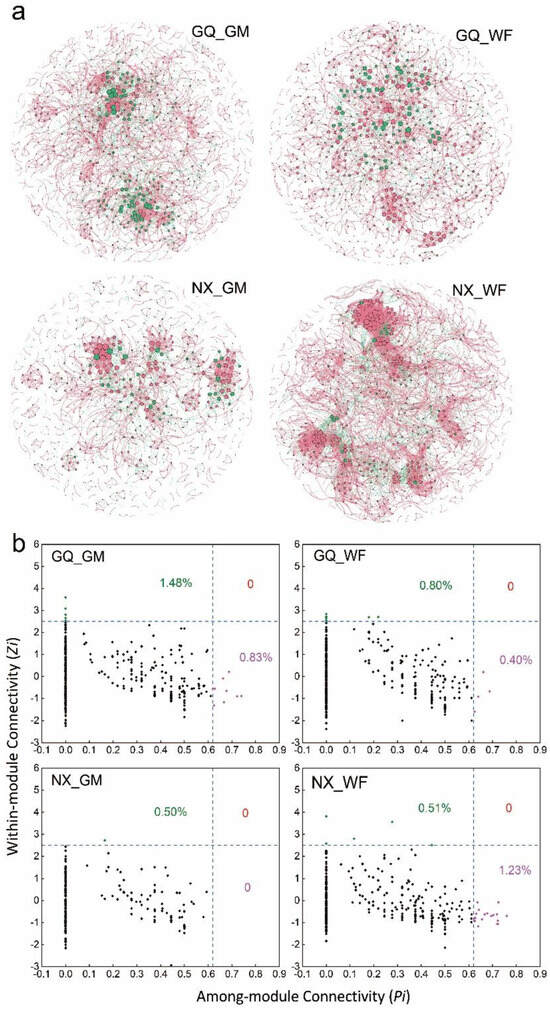 The combined bacterial–fungal networks were used to review the interactions between bacteria and fungi. The module number and modularity of the combined bacterial–fungal network in GM were higher than those in WF, indicating that green manuring increased network modularity (Table 2). Unlike in NX, GQ was observed with an increased number of nodes and edges due to GM treatment (Figure 6 and Table 2). In GM treatment, module hubs and connectors were identified in 1.32% and 0.73%, respectively, of the nodes at GQ and in 0.80% and 0.40%, respectively, of the nodes at WF. At NX, the percentages of module hubs and connectors in WF were higher than those in GM (Figure 6).