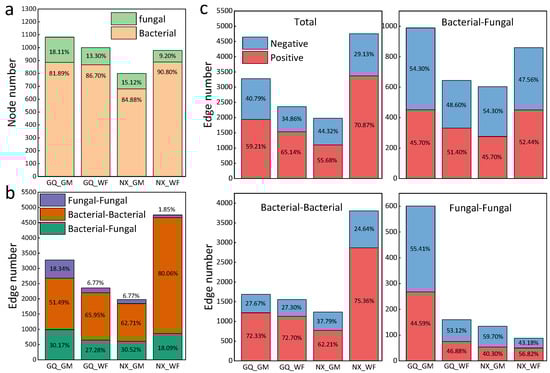The nodes in the combined bacterial–fungal networks included bacterial and fungal nodes. GM increased the proportion of fungal nodes. Approximately 18.11% and 15.12% of the nodes belonged to fungi in GM at GQ and NX, respectively, whereas 13.30% and 9.20% of the nodes belonged to fungi in WF at GQ and NX, respectively (Figure 7). The edges in the combined networks included bacterial–bacterial, bacterial–fungal, and fungal–fungal edges. GM treatment had higher percentages of bacterial–fungal edges (30.17% and 30.52% at GQ and NX, respectively) than WF treatment (27.28% and 18.09% at GQ and NX, respectively), indicating that green manuring enhanced the interactions between bacteria and fungi. GM had higher percentages of fungal–fungal edges than WF, whereas WF had more bacterial–bacterial edges (Figure 7). GM increased the percentages of negative edges (40.79% and 44.32% at GQ and NX, respectively) over WF (34.86% and 29.13% at GQ and NX, respectively) in the combined bacterial–fungal networks. The same trends were found in bacterial–bacterial, bacterial–fungal, and fungal–fungal edges (Figure 7).