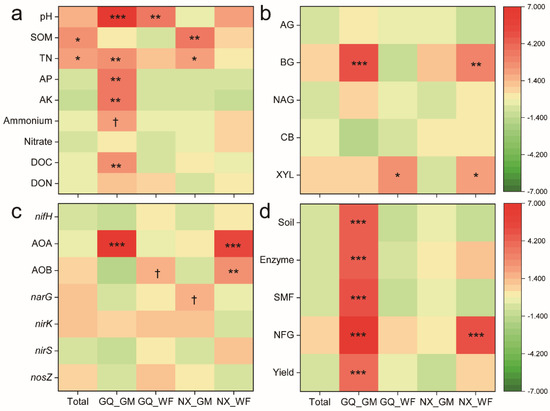 Mantel tests on keystone taxa in the combined bacterial–fungal ecological network and soil geochemical variables. SOM, soil organic matter; TN, soil total nitrogen; AP, soil available phosphorus; AK, soil available potassium; DOC, dissolved organic carbon; DON, dissolved organic nitrogen (a). AG, α-glucosidase; BG, β-glucosidase; NAG, N-acetyl-glucosamidase; CB, β-cellobiosidase; XYL, β-xylosidase (b). AOA, ammonia-oxidizing archaea amoA; AOB, amoA gene of ammonia-oxidizing bacteria (c). Soil, Z-score of soil properties; Enzyme, Z-score of C metabolism-related enzyme activities; SMF, soil multifunctionality, including soil properties and C metabolism-related enzymes; NFG, Z-score of copies of functional genes involved in N cycling (d). †, p < 0.1; *, p < 0.05; **, p < 0.01; ***, p < 0.0001. Figure 1 shows treatment abbreviations.